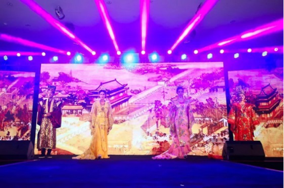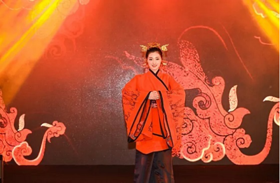 清雅的音乐声中,模特们身穿汉、唐、明、清、民国等各时代华夏礼服,款款从幕后走至T